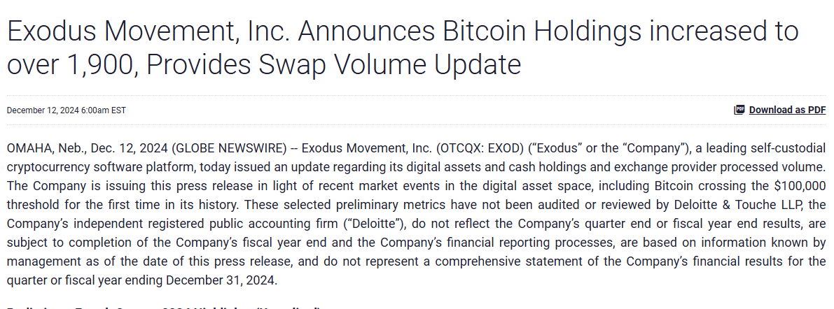 Dijital varlık cüzdan sağlayıcısı Exodus Movement, toplamda 200 milyon dolarlık bir Bitcoin (BTC) ve Ethereum (ETH) yatırımına sahip olduğunu duyurdu. Şirketin yaptığı resmi açıklamaya göre, 11 Aralık itibarıyla Exodus’un elinde 1.900 BTC ve 2.660 ETH bulunuyor.