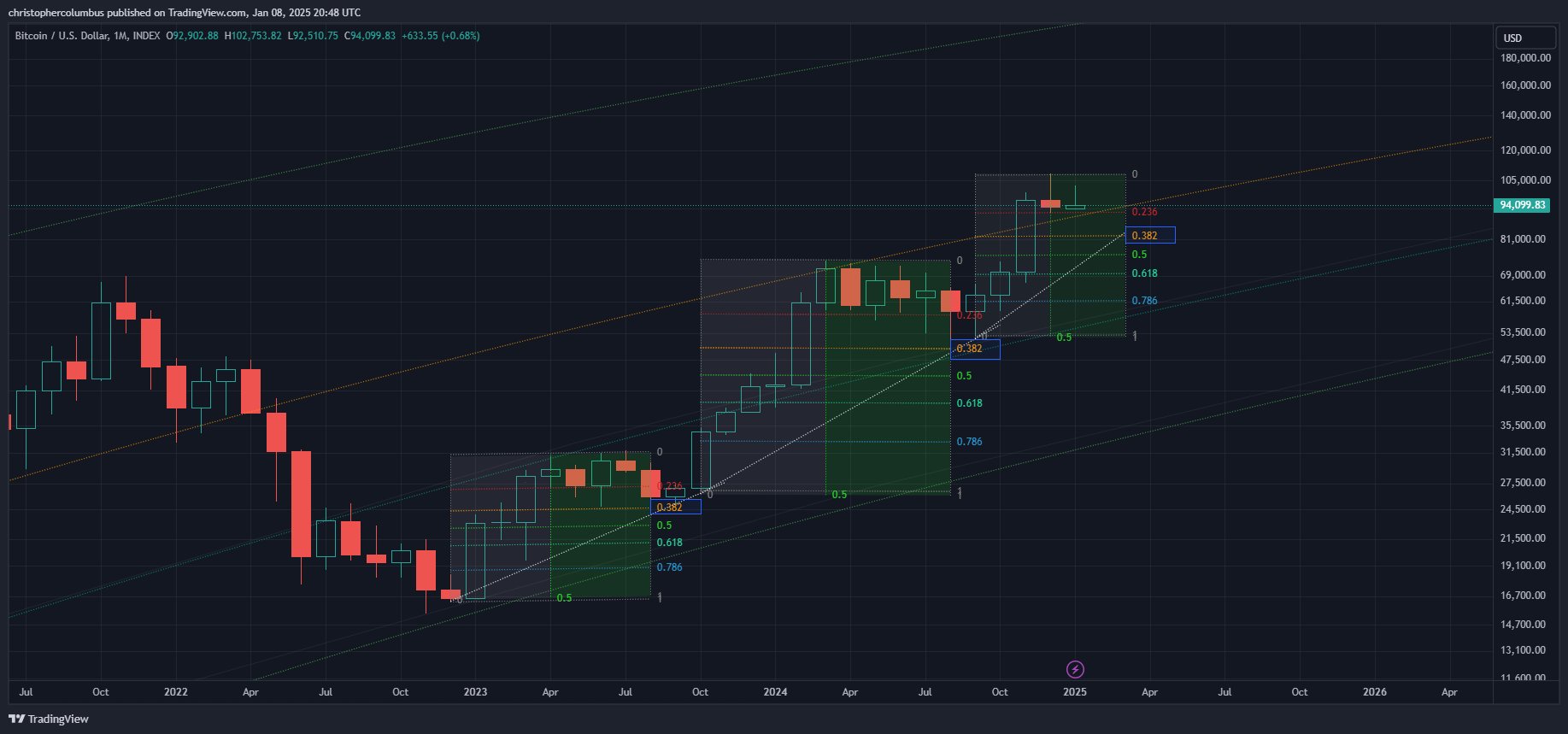 Fibonacci düzeltme seviyesi, traderlar tarafından Fibonacci sayı dizisine dayalı olarak bir varlık için potansiyel giriş ve çıkış noktalarını belirlemek için kullanılan bir araçtır. Analiste göre, “Model tekrarlanırsa kısa vadeli BTC volatilitesi gerçekleşecek.” Dave the Wave BTC’de kısa vadeli düşüş eğilimi gösterirken, 82.000 dolara doğru bir hareketin BTC’yi %119’luk bir artışa hazırlayabileceğini vurguluyor. Analist, “82.000 dolarlık BTC, 180.000 dolara çıkmayı sağlasa bu kadar kötü olur muydu?” diyor.