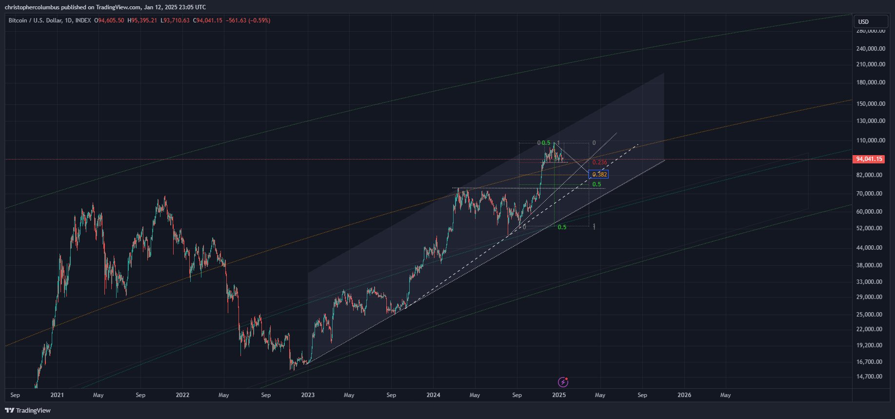 Kripto stratejisti ve analisti Dave the Wave, Bitcoin’in 90.000 doların altına düşebileceğine inanarak kripto varlık çöküşünü öngördü. Dave the Wave, Bitcoin’in 2023 ve 2024’te gözlemlenen bir modeli tekrar edebileceğini belirtiyor. BTC’nin yaklaşık 82.000 dolara düşebileceğini ve 0.382 Fibonacci geri çekilme seviyesine dokunabileceğini söyleyen bir grafik paylaşıyor. Fibonacci düzeltme seviyesi, bir varlığın potansiyel giriş ve çıkış noktalarını belirlemek için kullanılan bir ölçektir. Analist, logaritmik büyüme eğrisi (LGC) kanalına dayanarak Bitcoin’in yaklaşık yedi ay içinde bir boğa piyasası zirvesi yapacağına inanıyor. Dave the Wave, Bitcoin’in piyasa döngüsünün en yüksek ve en düşük seviyelerini tahmin etmek için kendi logaritmik büyüme eğrilerini kullanıyor. Şu anda Bitcoin 94.502 dolardan işlem görüyor. İşte analistin Bitcoin tahmini ve beklentiler…