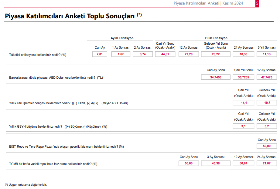 Türkiye Cumhuriyet Merkez Bankası (TCMB), 2024 Kasım ayına yönelik Piyasa Katılımcıları Anketi sonuçlarını açıkladı.