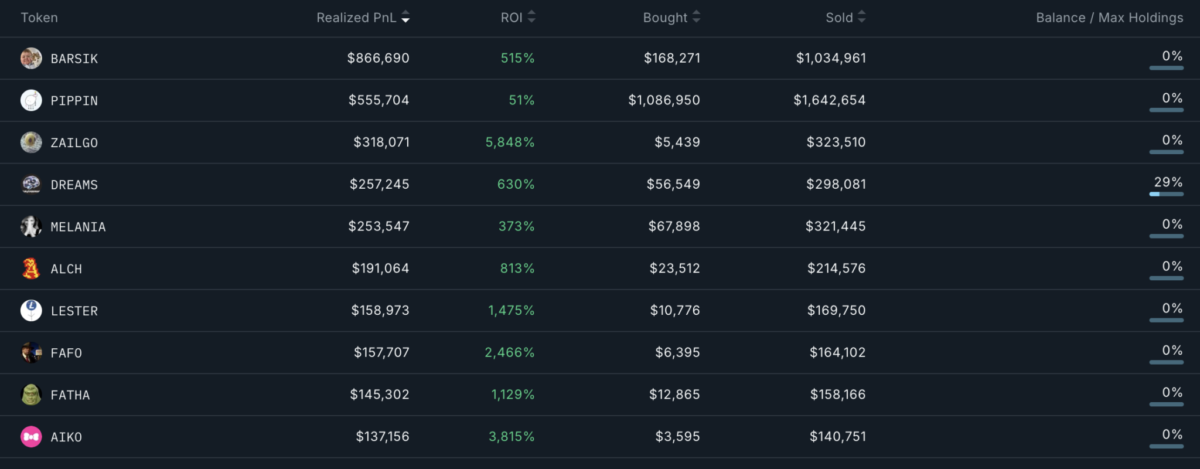 Son 90 gün içinde 192 farklı token alıp satan bu yatırımcı, ZAILGO yatırımında 5.439 doları tam 323.510 dolara çevirdi. BARSIK yatırımı da oldukça etkileyiciydi. 168.271 dolar yatırarak tam 1.03 milyon dolar kazanç sağladı. Bu cüzdanın en dikkat çeken özelliklerinden biri, 11 farklı token yatırımında 1.000%’in üzerinde getiri elde etmesi. Ayrıca, 100.000 doların üzerinde kazanç sağladığı 13 farklı token bulunuyor.