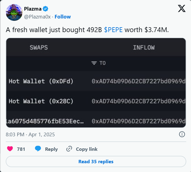 1 Nisan 2025’te, yeni oluşturulmuş bir cüzdan üzerinden tam 492 milyar PEPE satın alındı. Bu işlem yaklaşık 3.74 milyon dolarlık bir değere denk geliyor. Bu ölçekteki bir alım, piyasada ciddi bir talep oluştuğuna işaret ediyor.