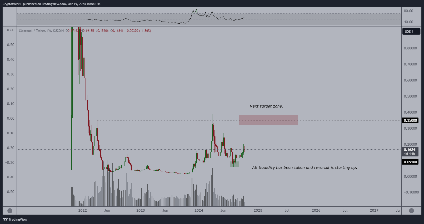 Van de Poppe, düşük piyasa değerine sahip olan Clearpool (CPOOL) tokenine de dikkat çekiyor. Şu anda 0.167 dolardan işlem gören CPOOL, tüm zamanların en yüksek seviyesi olan 2.55 dolardan %93 oranında düşmüş durumda. Ancak analist, CPOOL’un yeni bir döngü başlattığını ve 2024 hedeflerinin yükselişi işaret ettiğini söylüyor.