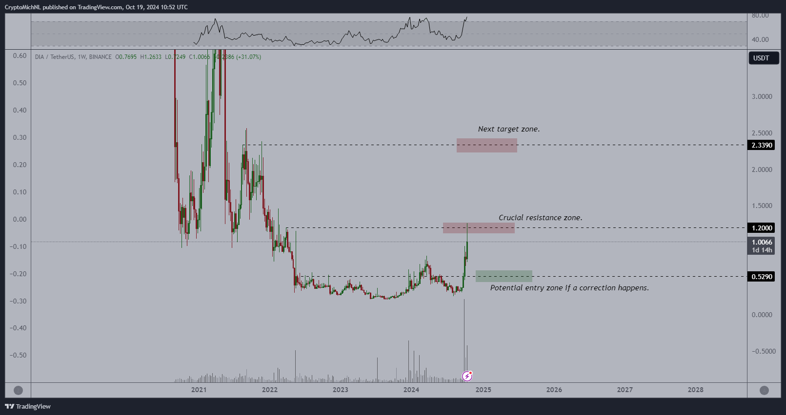 Van de Poppe ayrıca blockchain oracle platformu DIA’ya dikkat çekiyor. Analiste göre, DIA’da da güçlü bir yükseliş eğilimi var ve bu trendin devamı bekleniyor. Altcoin fiyatı 0.50 dolar seviyesine geri çekilme veya 1.20 dolara çıkış ihtimali taşıyor. DIA’nın şu anki grafiği, potansiyel bir breakout hareketine işaret ediyor. Van de Poppe, olası düzeltmelerin kısa vadede iyi alım fırsatları yaratabileceğini ifade ediyor. Uzun vadede DIA’nın büyük bir potansiyele sahip olduğunu düşünen analist, yatırımcıların bu projeyi yakından takip etmeleri gerektiğini belirtiyor.