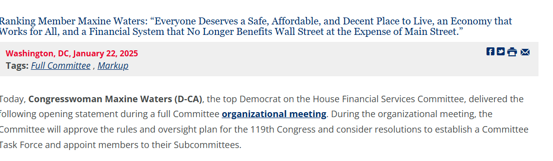 22 Ocak tarihli toplantıda Maxine Waters, 119. Kongre oturumunda komitenin çalışma planını tartıştı. Toplantıda, Cumhuriyetçilerin çoğunluğa sahip olduğu Temsilciler Meclisi’nde kripto firmaları ve diğer finansal kuruluşlar üzerindeki denetim eksikliğini “endişe verici” olarak nitelendirdi.