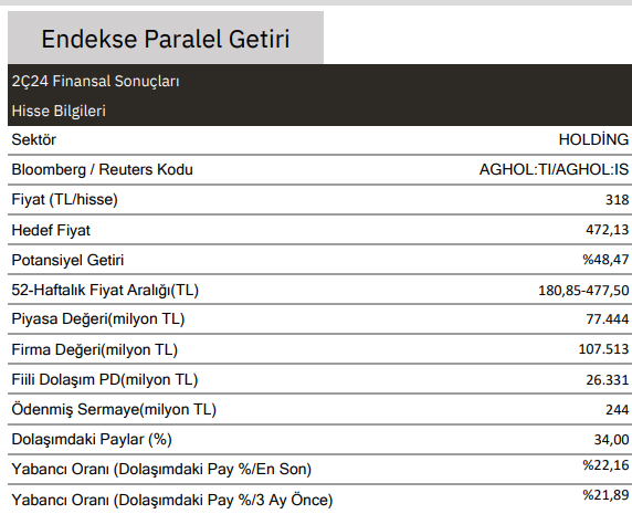 Holding, 2Ç24’te 1.806 mn TL net kar (yıllık: -%68) açıklamıştır. Hisse, son önerimizin “Endeksin Üzerinde Getiri” yerine “Endekse Paralel Getiri” olarak değişmesinden bu yana XU100’ün %19 altında performans göstermiştir. Ancak hissede son dönemde yaşanan satışlar daha anlamlı bir yukarı yönlü potansiyel yaratmış ve bizim görüşümüze göre hisse yeniden alım fırsatı sunmaktadır. 2Ç24’te alkolsüz içecekler segmenti %1 hacim daralmasıyla 451 milyon ünite ve %7 reel düşüşle 36,6 milyar TL satış geliri açıklamıştır.