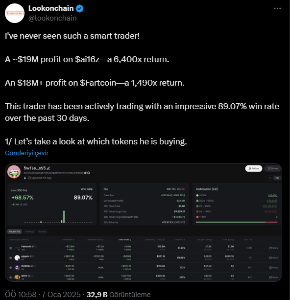 Kripto para piyasasındaki bir trader kısa bir süre içinde önemli kârlar elde etti. Lookonchain verilerine göre, trader sadece 30 gün içinde %89,07 gibi etkileyici bir kazanç elde etti. Traderın başarısı, $ai16z token’a yaptığı yatırımda görülebilir. Başlangıçta 3.000 dolar karşılığında 9,16 milyon ai16z coin satın alan trader, bunun bir kısmını 1,71 milyon dolar karşılığında satarken, 17,26 milyon dolar değerinde 7,85 milyon ai16z coin tutmaya devam etti. Bu işlem, 6.400 katlık bir getiri ile toplam 19 milyon dolarlık bir kârla sonuçlandı. Trader ayrıca $Fartcoin ile de kayda değer bir başarı elde etti ve 17,31 milyon dolar değerinde token için 12.200 dolar yatırım yaptı. Bir kısmını 5,41 milyon dolara sattılar ve şu anda $Fartcoin’de 12,83 milyon dolar tutuyorlar. Bu da toplam 18 milyon doların üzerinde bir kârla sonuçlanıyor. Ayrıca trader, yeni satın aldığı birkaç coinle de gündeme geldi.