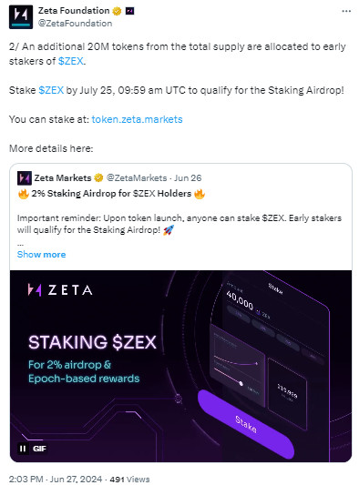 ZEX token arzının %30’u, her dönemden sonra 28 günde bir Zeta yatırımcılarına dağıtılan devam eden ticaret teşviklerine tahsis edildi. İlk “Genesis Epoch”, 25 Temmuz’a kadar sürecek. Ayrıca proje, alım satım ödülleri olarak 8 milyon ZEX token dağıtacak.