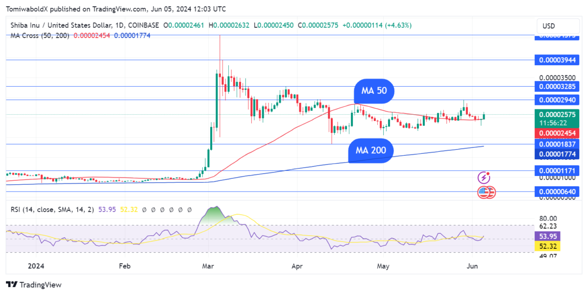 Kripto analisti Tomiwabold Olajide, SHIB’in teknik resmini değerlendiriyor. Shiba Inu şaşırtıcı bir geri dönüş gerçekleştirdi. Böylece, Basit Hareketli Ortalama (SMA) 50’yi 0,0000245 dolardan geçti. Bu hamleye yaklaşık %10’luk önemli bir fiyat sıçraması eşlik etti. Günlük SMA 50 değeri 0,0000245 dolar Shiba Inu için bir direnç seviyesi oldu. Nisan ortasından bu yana fiyatını sınırladı ve bir kırılmayı engelledi. Ancak SHIB, Mayıs ayı sonlarında bu engeli geçici olarak aşarak 29 Mayıs’ta 0,0000294 dolara ulaştı.
