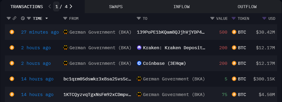 According to Arkham, the German Government transferred a total of 400 BTC to Coinbase and Kraken (200 BTC each) at 15:38 UTC+8 today, worth about $24.34 million. Last week, the German Government transferred a total of 1,700 BTC to Coinbase, Bitstamp, and Kraken.…