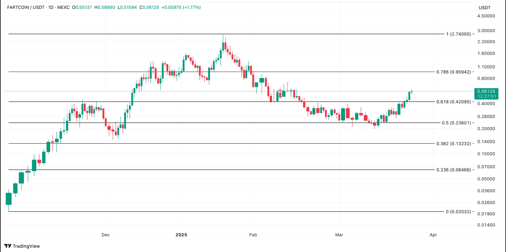 Son günlerin dikkat çeken diğer bir meme coin’i ise FARTCOIN. 0,56 dolardan işlem gören token, yalnızca son 24 saatte %11 değer kazandı. Mart ayı başında 0,19 dolarla dip yapan coin, o günden bu yana %200’lük etkileyici bir yükselişe imza attı.