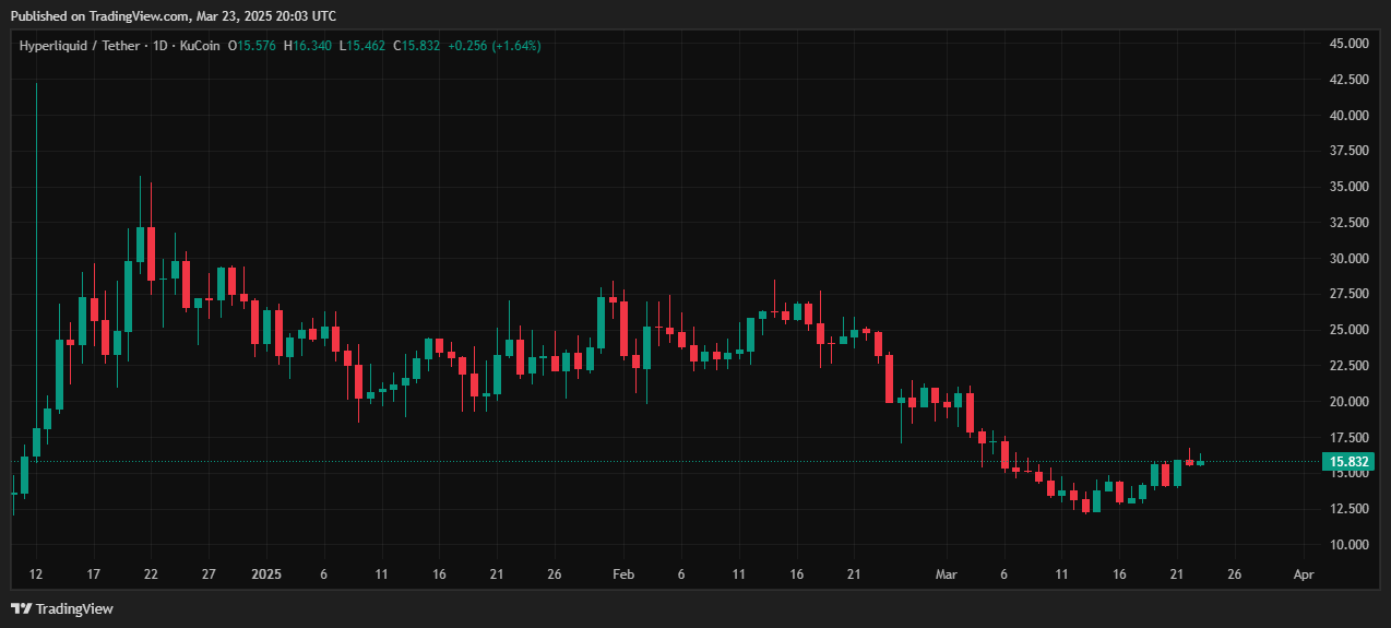 İlk olarak 19-20 Mart arasında 13.80’den 15.60’a yükselen token, ardından kısa süreli bir düzeltmeyle 14.20 seviyesine geriledi. Ancak 22 Mart’ta alıcıların yeniden devreye girmesiyle HYPE 16.40 seviyesine ulaştı.