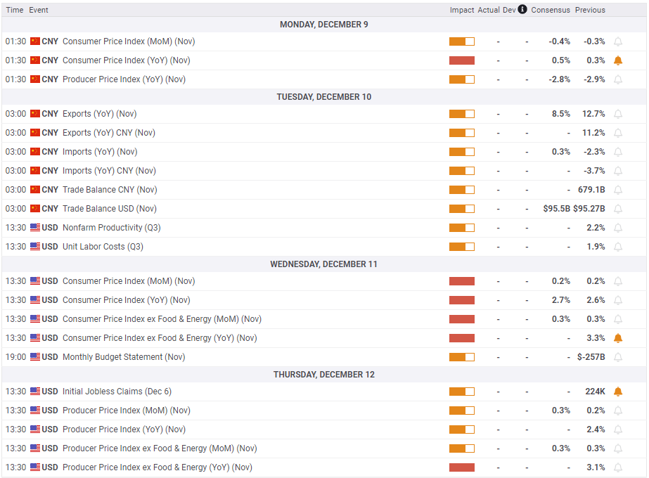 Çarşamba günü ABD BLS Kasım ayı Tüketici Fiyat Endeksi (TÜFE) rakamlarını gelecek. Piyasa, aylık bazda, değişken gıda ve enerji fiyatlarını içermeyen çekirdek TÜFE’nin Ekim ayında olduğu gibi %0,3 oranında artmasını bekliyor. 0,5 ya da daha yüksek bir oran, enflasyonun yükseleceği yönündeki korkuları yeniden canlandırır. Bu senaryoda, ani tepki muhtemelen ABD tahvil getirilerinde bir yükselişi tetikleyecektir. Ayrıca, altın üzerinde baskı yaratacaktır. Diğer taraftan, %0,3 veya daha düşük bir yumuşak veri tam tersi bir etki oluşturur.