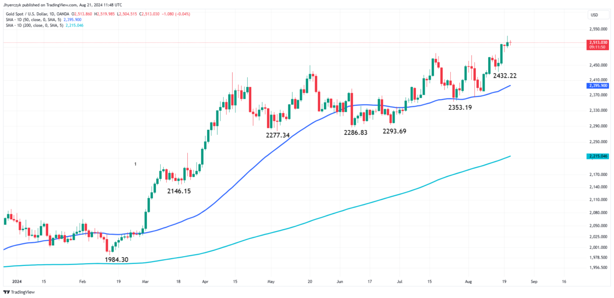 Altın fiyatları 2.531,77 dolarlık rekor seviyenin ardından hafif bir düşüş yaşadı. Traderlar yön için Fed’in bir sonraki politika hamlesine bakıyor. Piyasa, Fed tutanaklarını ve Powell’ın Jackson Hole konuşmasını bekliyor. Bu da altının 2.550 doların üzerine çıkması için çok önemli. Dolardaki zayıflığa rağmen altın fiyatları yüksek seviyelerini korumakta zorlanıyor. Dolayısıyla, bu da yaklaşan olası dalgalanmalara işaret ediyor. Analistler, Fed’in faiz indirim döngüsünün altın fiyatlarını 3.000 dolara doğru çekebileceğini ve yükseliş hissiyatını canlı tutabileceğini öngörüyor.