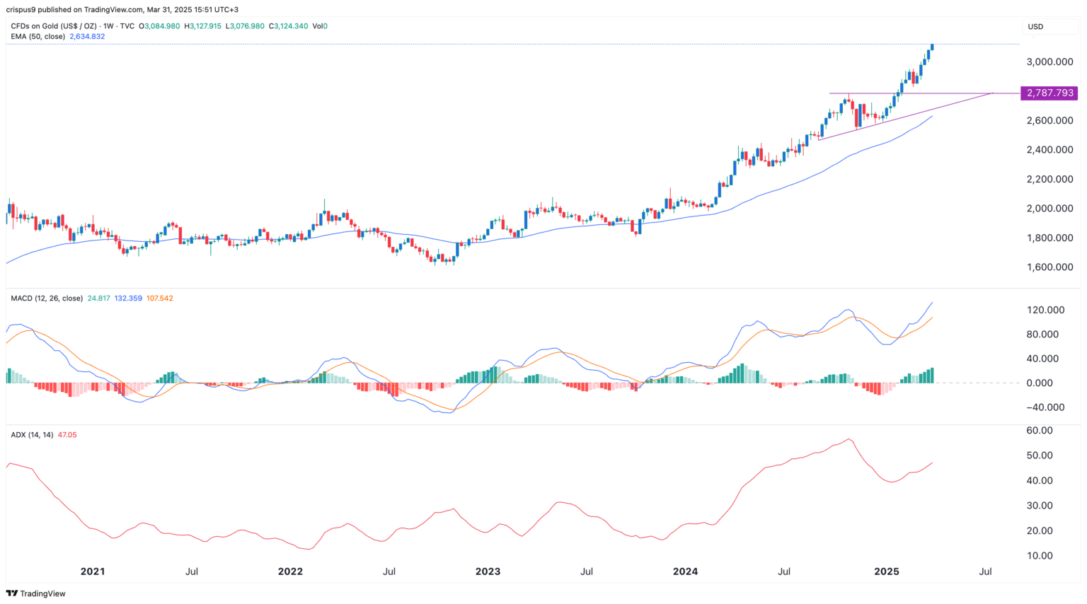 Ayrıca, altın fiyatları 50 haftalık Üstel Hareketli Ortalama’nın (EMA) üzerinde kalmaya devam ediyor. Ortalama Yön Endeksi (ADX) ise 47 seviyesine yükselmiş durumda. Bu, momentumun güçlü olduğunu gösteriyor.