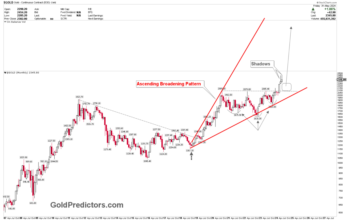 Teknik açıdan baktığımızda, altın piyasası Mayıs 2024’ün son birkaç gününde aşağı yönlü düzeltme yaptı. Böylece, 2024 Nisan’daki formasyona benzer şekilde aylık mumu keskin gölgelerle kapattı. Bu hareketi bekliyorduk. Aylık mumlar artık bir sonraki yukarı yönlü momentumdan önce aşağı yönlü veya konsolidasyon aşamasına işaret eden keskin gölgeler gösteriyor. Bu formasyon, yükselen genişleyen kama formasyonları içinde güçlü bir boğa momentumuna işaret ediyor. Bu yüzden yüksek volatilite muhtemelen devam edecektir. Önemli ekonomik belirsizlik ve jeopolitik krizler bu oynaklığı daha da körükleyecektir. Ayrıca, güçlü bir yukarı yönlü hareket başlatacaktır.