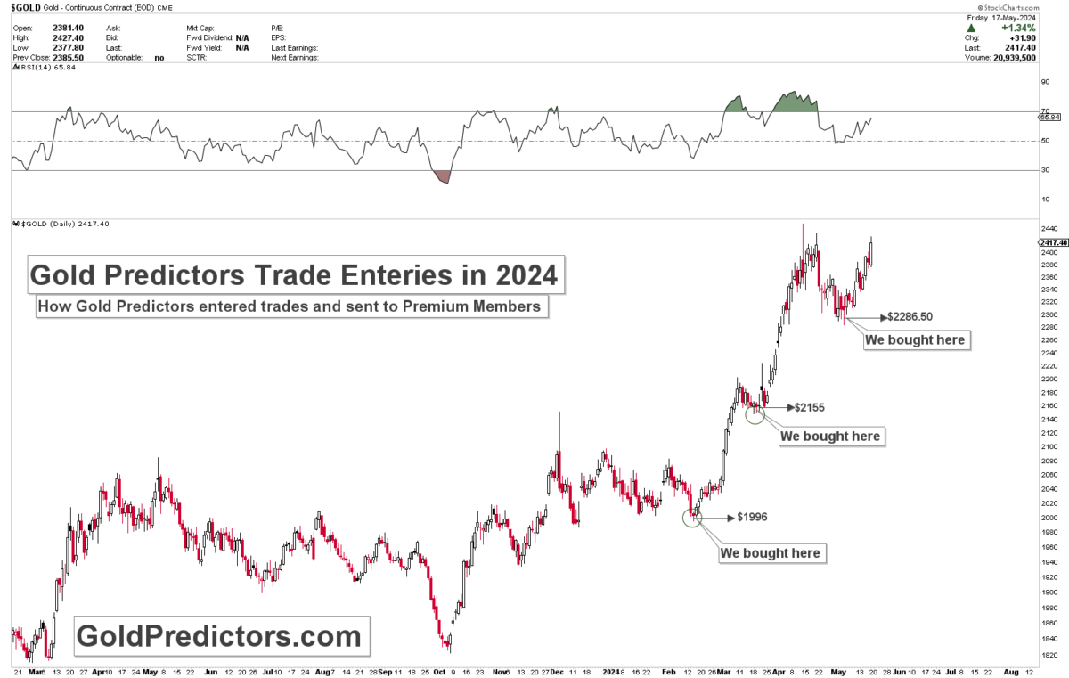 Örneğin, God Predictors 2024 yılında altın piyasası önemli seviyeleri kırarken farklı bir yaklaşım benimsedi. Gold Predictor düşük seviyelerden altın satın aldı. 2024’te bir swing ticareti için ilk giriş 1.996 dolardaydı ve fiyat dibi doğruladı. Bu dönemde birçok yatırımcı ve trader fiyatların daha da düşmesini bekliyordu. İkinci sinyal 2.155 dolardan altın alımı yönündeydi. Ayrıca, sinyal geldiğinde fiyat dip seviyeyi teyit etti. Yatırımcıların bu teknikleri 2024’teki boğa piyasası sırasında dibi belirlemek için kullanmaları mümkün.