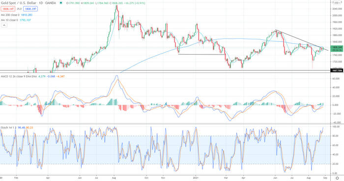 Altın fiyatları, Fed Başkanı Powell’ın Jackson Hole’da yaptığı konuşmanın ardından Cuma günü yükseldi ve haftayı %1,7 kazançla kapattı. Analist David Becker’e göre, ABD Hazine verimleri düştükçe, tüketici duyarlılığı azaldıkça ve enflasyon beklentileri düştükçe dolar düştü. Jerome Powell piyasalara, Fed’in 2021’de bir ara tahvil alım programını azaltmayı başlatacağının sinyalini verdi. Ayrıca, Fed Başkanı’nın enflasyon ve büyüme daha hızlı bir şekilde artarken, sonunda faiz oranlarını artırabilmesi için enflasyon istediği görülüyor. David Becker’ın altın fiyatları için teknik analizi ise şu şekilde:
