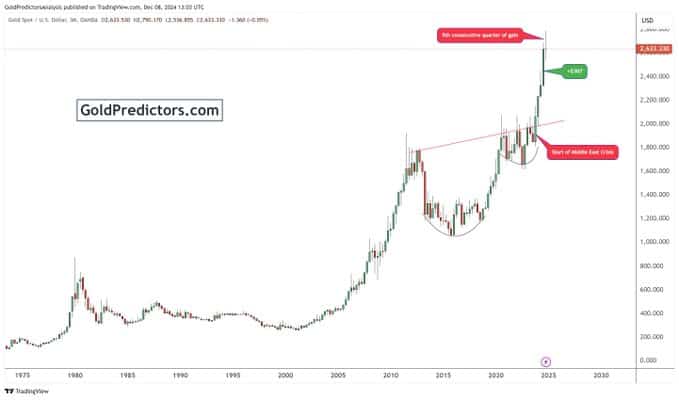 Altın, bazı analistlerin önümüzdeki yıl da devam edeceğini öngördüğü kayda değer çeyreklik artışlarla 2024 yılında tarihi bir fiyat artışı serisi yaşadı. Özellikle, altın fiyatları art arda beş çeyrek büyüme kaydetti.