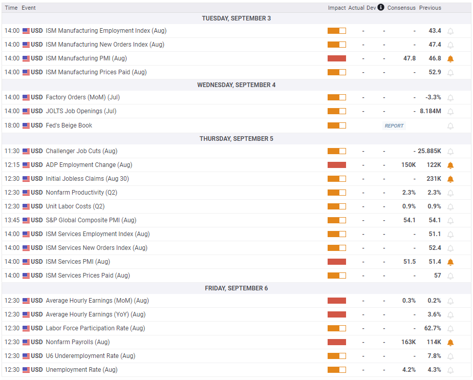 ABD’de finansal piyasalar Pazartesi günü İşçi Bayramı tatili nedeniyle kapalı olacak. Salı, Ağustos ayı ISM İmalat Satın Alma Müdürleri Endeksi (PMI) ABD ekonomi gündeminde yer alacak. Yatırımcılar manşet PMI değerinin Temmuz ayındaki 46,8 seviyesinden 47,8’e yükselmesini bekliyor. İmalat sektöründeki iş faaliyetlerinin genişleme bölgesine geri döndüğünü gösteren 50’nin üzerindeki bir veri, ani tepki ile USD’ye destek sağlayabilir ve altın üzerinde baskı oluşturabilir.