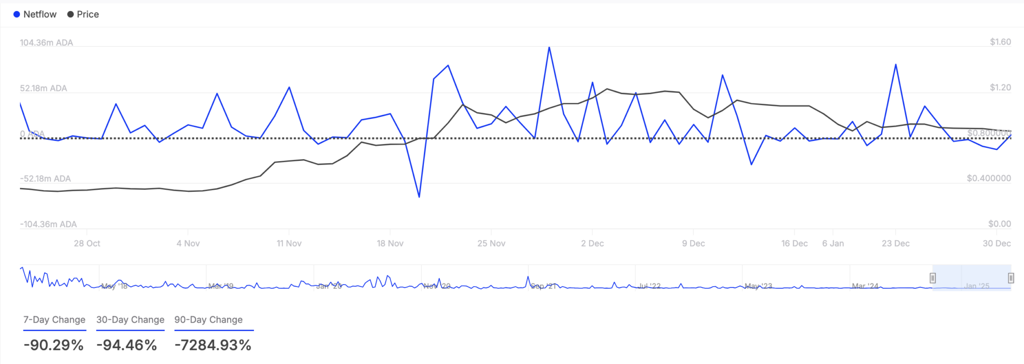 IntoTheBlock’a göre, özellikle ADA balinaları geçtiğimiz hafta alım satım faaliyetlerini azalttı. Ayrıca, altcoin’in büyük holderlarının net akışı %90,29 oranında düştü. Bir varlığın dolaşımdaki arzının %0,1’inden fazlasını elinde tutan adresler olarak tanımlanan büyük holderlar, piyasa hareketlerinde önemli bir rol oynar. Net akışlarındaki düşüş, satın alma faaliyetlerinin azaldığını ve ADA Coin fiyatı üzerindeki aşağı yönlü baskıyı artırdığını gösteriyor.