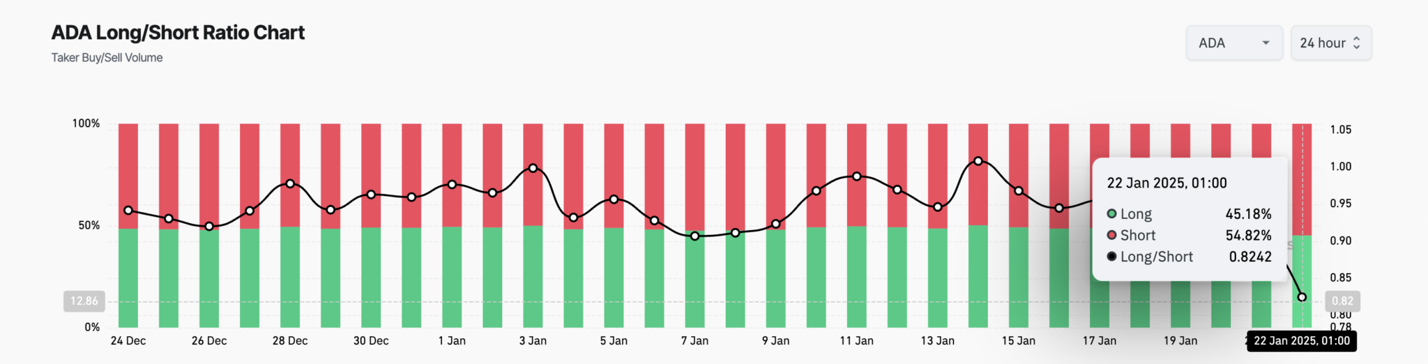 Coinglass’a göre, ADA’nın Long/Short Oranı aylık 0,82 ile en düşük seviyede. Bu da short pozisyonlar için yüksek talep olduğunu gösteriyor. Bir varlığın Long/Short Oranı, bir piyasadaki long (alış) pozisyonlarının sayısını short (satış) pozisyonlarıyla karşılaştırır. ADA’da olduğu gibi, oran birin altında olduğunda, daha fazla trader fiyatın yükselmek yerine düşeceğine (shorting) bahse giriyor. Açığa satanlar baskın olmaya devam ederse, bu durum ADA Coin fiyatı üzerindeki aşağı yönlü baskıyı artırabilir.