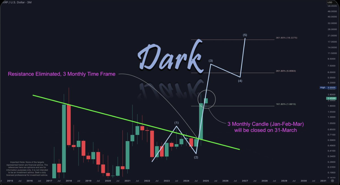 Dark Defender’ın X platformunda yaptığı açıklamaya göre, XRP’nin hedefi önce 5,85 dolar, ardından 8,07 dolar. Analist, bu tahminini 3 aylık mum grafiklerine dayandırıyor. Ocak, Şubat ve Mart aylarını kapsayan bu zaman diliminde XRP’nin yukarı yönlü büyük bir ivme kazandığını söylüyor.