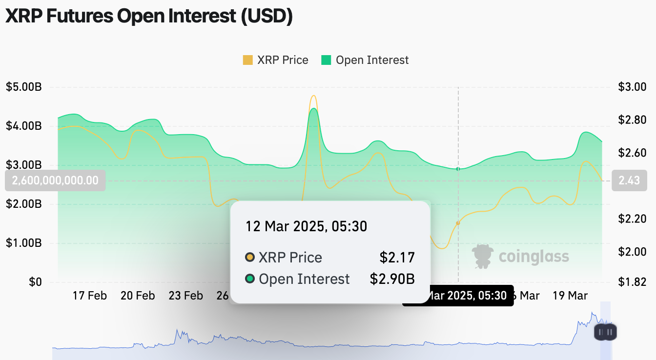 Yükseliş sinyalleri sadece spot piyasada değil, türev piyasasında da dikkat çekiyor. Coinglass verilerine göre, XRP vadeli işlem açık pozisyonları (OI) 12 Mart’tan bu yana 2 milyar dolardan 4 milyar dolara yükseldi. Bu artış, kurumsal yatırımcıların yeniden XRP’ye ilgi göstermeye başladığını kanıtlıyor.