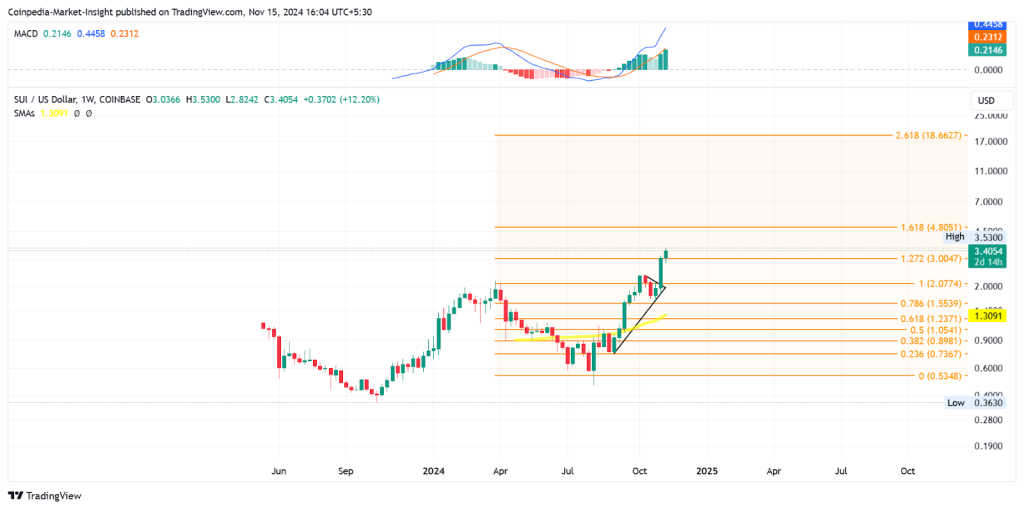Düşüş mumlarındaki düşük fiyat reddi, yükselişin tersine dönme olasılığının güçlü olduğunu gösteriyor. Fibonacci seviyelerine göre, SUI için yukarı yönlü hedef 2,618 Fibonacci seviyesiyle aynı hizada olan 4,57 dolar. Haftalık grafikte, Fibonacci analizi 18,66 dolarlık uzun vadeli bir hedef öneriyor. Bu da yaklaşık %500’lük bir yukarı yönlü potansiyel demek. SUI, büyüyen ekosistemi ve önemli potansiyeli ile 10 kat getiri sağlaması mümkün.