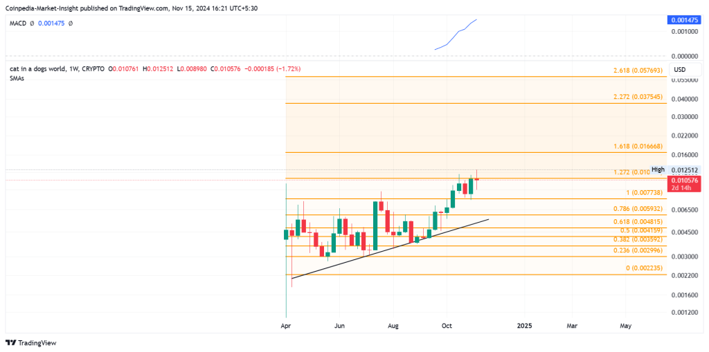 MEW, 965 milyon dolarlık piyasa değeriyle en büyük ikinci kedi temalı meme coin. Solana ekosistemi üzerine inşa edilen daha geniş ekosistem toparlanmasının MEW tokenine yönelik ek talebi artırması bekleniyor. Altcoin, sadece yedi gün içinde %135’lik bir fiyat artışı gördü. Böylece, bir trend çizgisi kırılma rallisi gösteriyor. Bu kırılma, tüm zamanların en yüksek seviyesine ulaşma potansiyeline işaret ediyor. Fibonacci seviyelerine göre, 0,016 doların üzerindeki bir kırılma MEW fiyatını 0,057 dolara çıkararak bu meme coin için önemli bir yukarı yönlü potansiyel sunabilir.