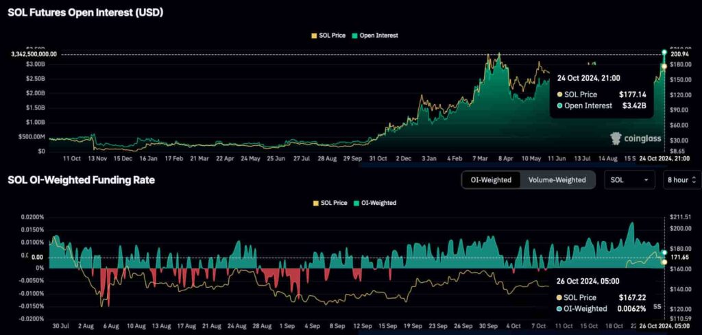SOL Vadeli İşlem Açık Faiz ve OI-Ağırlıklı Fonlama Oranı. Kaynak: CoinGlass