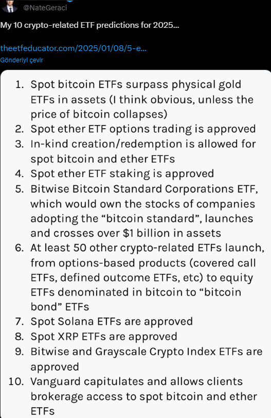 ETF Store Başkanı Nate Geraci, Solana ve Türkiye’de çokça takip edilen XRP için sevindiren açıklamalar yaptı. Zira Geraci’ye göre 2025’te bu kripto para birimleri, kripto ETF ortamında önemli bir rol oynayabilir. Geraci, bu varlıkların spot ETF’lerine potansiyel olarak dahil edilebileceğini ve bunun kripto piyasası için dönüm noktası olabileceğini öngörüyor. Solana’nın, VanEck’in ABD’deki ilk Solana ETF başvurusunu yapmasının ardından Grayscale, Canary Capital ve 21Shares’in girişleriyle büyük ses getirdiği belirtiliyor. XRP için de Canary Capital’in bir ETF başvurusu yapması, daha geniş bir kabul ve benimseme için zemin hazırladı. ABD’nin yeni yönetiminin desteğiyle bu ETF başvurularının onaylanabileceği umut ediliyor. Geraci, XRP ve Solana’nın ötesinde, Bitcoin ETF’lerinin fiziksel altın ETF’lerine rakip olabileceğini ve Ethereum stake ETF’lerinin onay alabileceğini öngörüyor. Ayrıca Grayscale, Bitwise ve hatta Vanguard gibi geleneksel firmaların kripto ETF piyasasına girebileceğine inanılmakta. İşte detaylar…
