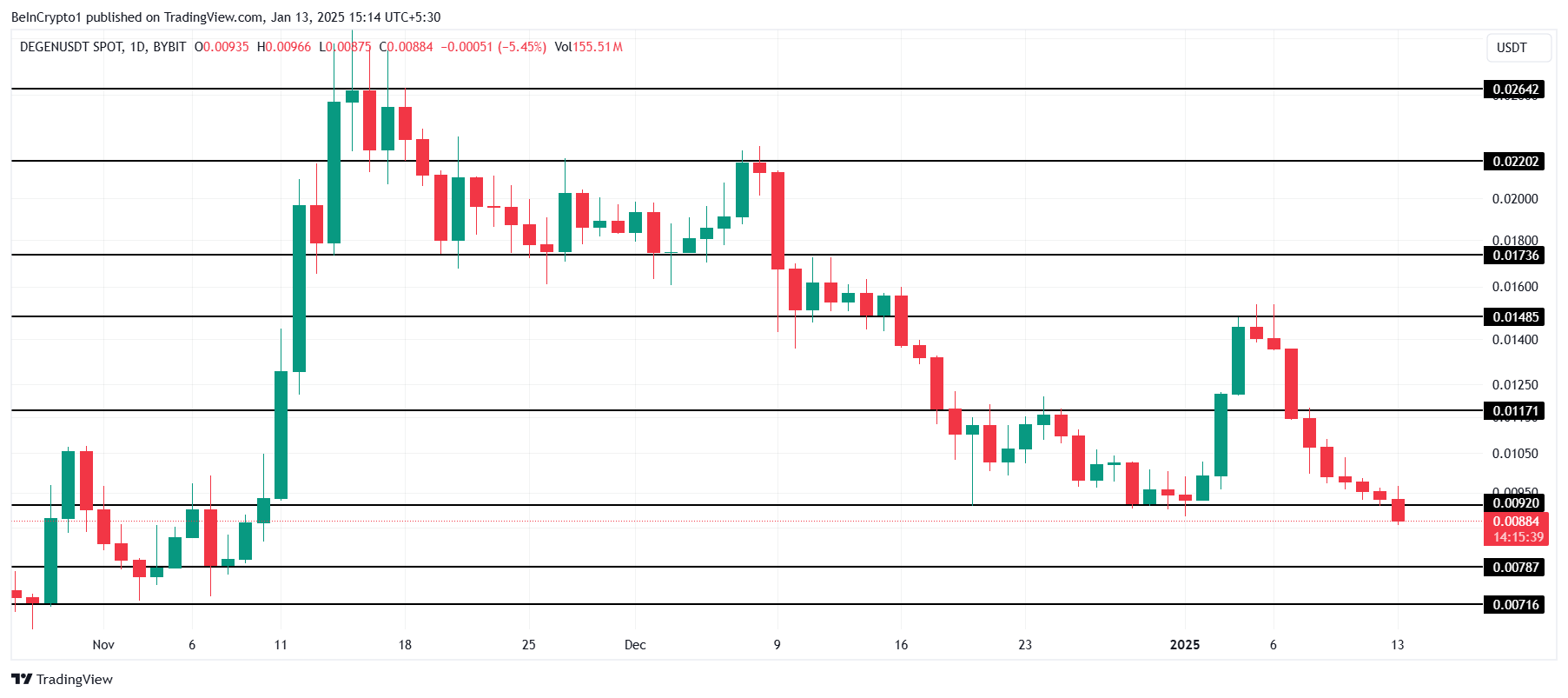 DEGEN Fiyat Analizi. Kaynak: TradingViewDüşüş trendi devam ederse, DEGEN’in fiyatı 0,0078 dolara düşerek kritik bir destek seviyesini test edebilir. Bu desteğin korunamaması, fiyatın potansiyel olarak 0,0071 dolara düşerek mevcut boğa görünümünü geçersiz kılmasıyla birlikte daha fazla düşüşe yol açabilir.