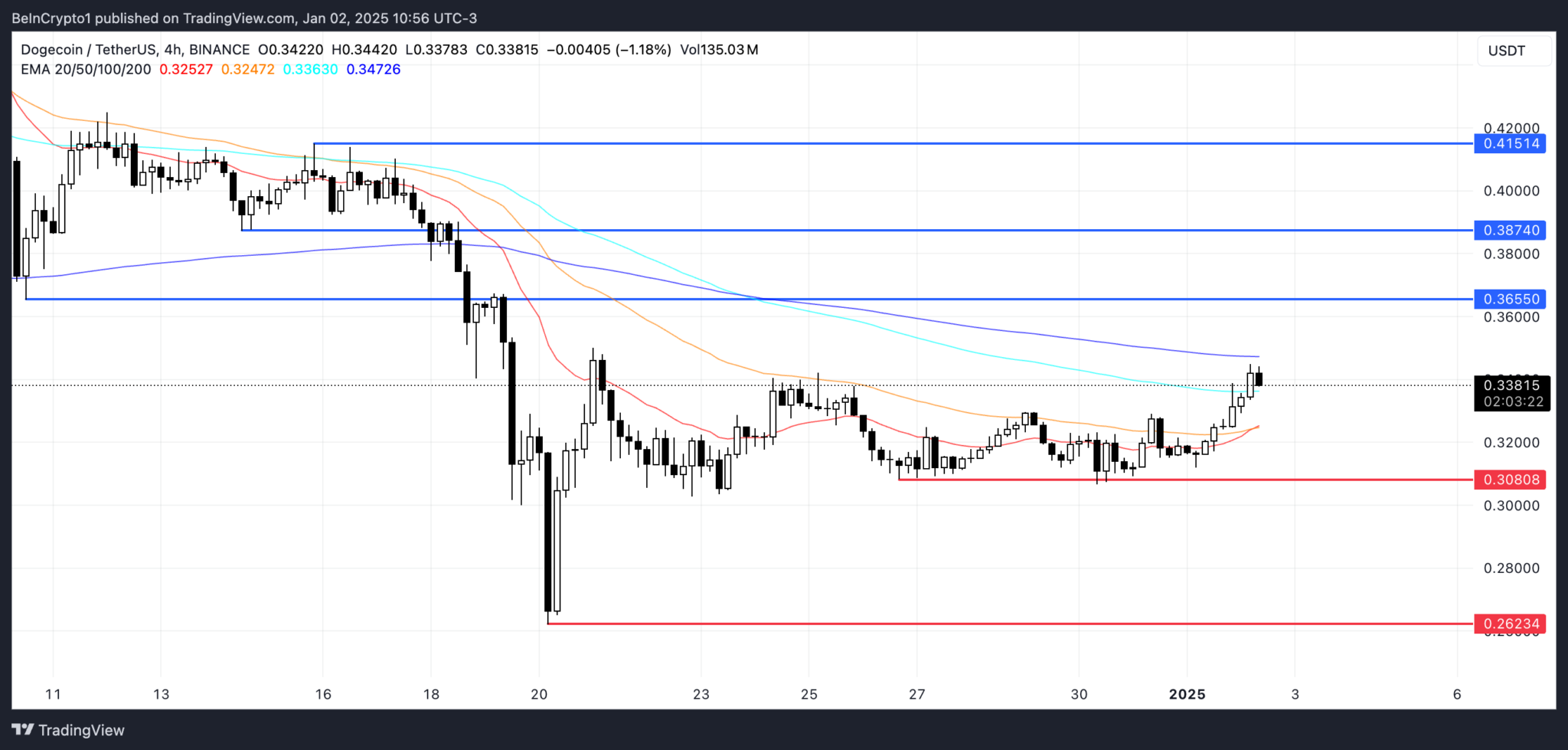 Dogecoin (DOGE) fiyatı EMA çizgileri, kısa vadeli EMA’nın uzun vadeli EMA’nın üzerinden geçtiği bir yükseliş göstergesi olan Altın Haç’ın (Golden Cross) yakında oluşabileceğini gösteriyor. Bu potansiyel geçiş, yükseliş trendinin devam edeceğine işaret ediyor. Böylece, DOGE’nin direnci 0,36 dolardan test etmesine olanak sağlıyor. Bu seviyeyi kırarsa, DOGE’nin 0,387 dolar ve 0,415 dolarlık daha yüksek direnç seviyelerini hedeflemesi mümkün. Bu da %22,7’lik potansiyel bir fiyat artışı temsil ediyor.