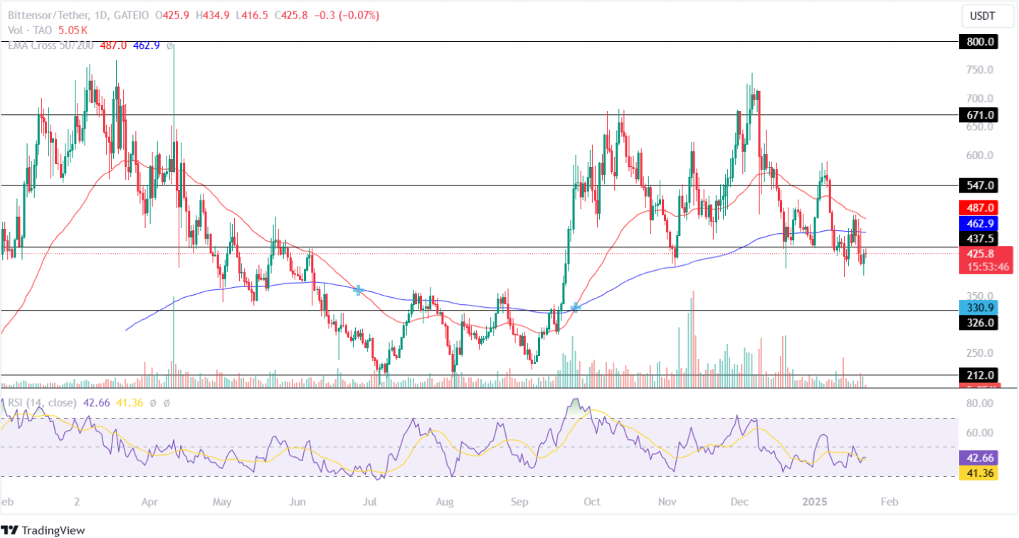 TAO geçtiğimiz gün 172,79 milyon dolarlık işlem hacmiyle yükselişe geçti. YTD getirisi -%5,26 olmasına rağmen, bu kripto token kategorideki konumunu korudu. RSI göstergesi 1D zaman diliminde nötr noktaya doğru bir yükseliş gösteriyor. Ancak, EMA 50/200 günlük düşüş fiyat hareketi kaydediyor. Bu, piyasadaki Bittensor için karışık bir duygu olduğunu gösteriyor. Fiyatın 437,5 dolarlık direnç seviyesinin üzerinde tutulması, TAO’nun bu ay 547 dolarlık üst direnç seviyesine doğru itebilir. Bununla birlikte, düşüşün tersine dönmesi durumunda, bu AI token önümüzdeki dönemde 400 dolarlık destek trend çizgisini yeniden test edebilir.