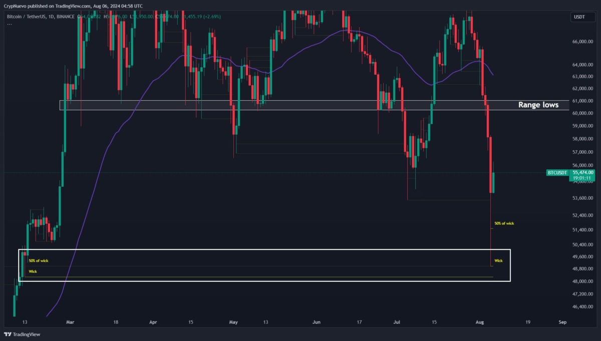 Bitcoin, dev bir günlük mum fitili analistleri ürkütüyor. Bu nedenle BTC 50.000 doların altına bir yolculuk daha yapma riski taşıyor. Popüler analist CrypNuevo’ya göre, fiyatlardaki son dalgalanmayla BTC altı ayın en düşük seviyelerine inecek.