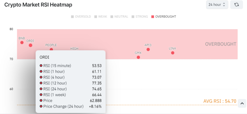 Kripto Piyasası RSI 24 Saat Isı Haritası: BNB. Kaynak CoinGlassİkinci sırada Ordi (ORDI) var