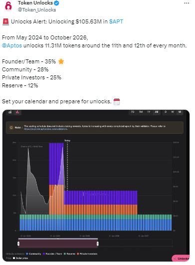 Aptos, 2024 Mayıs’tan 2026 Ekim’e kadar kademeli olarak piyasaya yaklaşık 105,63 milyon dolar değerinde token sürmeyi planlıyor. Proje, her ayın 11’inde ve 12’sinde 11,31 milyon token yayınlayacak. Bir sonraki kilit açma işlemi 12 Haziran’da gerçekleşecek. Bu sefer 11,31 milyon APT tokeni piyasaya sürecek. Bunun değeri 102,69 milyon dolar. Dağılım şu şekilde oalcak: