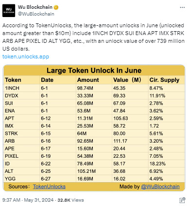 Her ay token-unlock olayları açılması hakkında konuşuyoruz. Bu Haziran ayında da bu geleneği sürdüreceğiz. Çünkü piyasaya çok sayıda token çıkmak üzere. Bu ay da bazı büyük altcoinler var. Token-unlock ilgili altcoin fiyatlarını önemli ölçüde etkileme potansiyeline sahip. Kripto analisti Lawrence Mike Woriji, bu ay içinde gerçekleşecek diğer yüklü token-unlock etkinlilerine bakıyor.