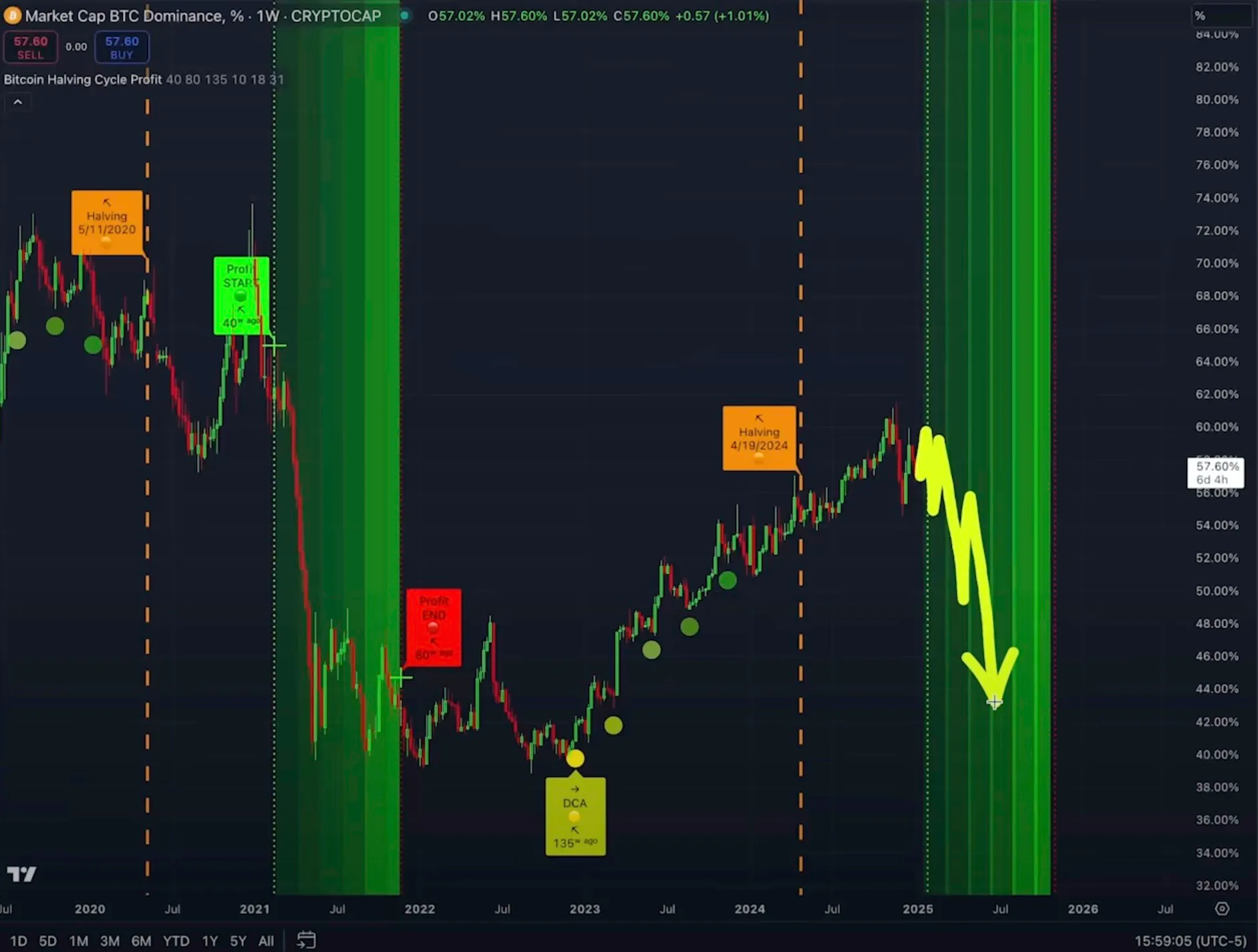 Svenson’un projeksiyonları, TOTAL3 piyasa değerinin 2 trilyon dolara ulaşabileceğini gösteriyor. Şu anda 982 milyar dolar seviyesinde olan piyasa değeri için bu artış, altcoin piyasasında büyük bir genişleme anlamına geliyor. Bununla birlikte, analist Bitcoin dominansında da ciddi bir düşüş bekliyor. Geçmişte, halving sonrası Bitcoin dominansı %40’lara kadar gerilemişti. Svenson bu durumu şöyle açıklıyor: