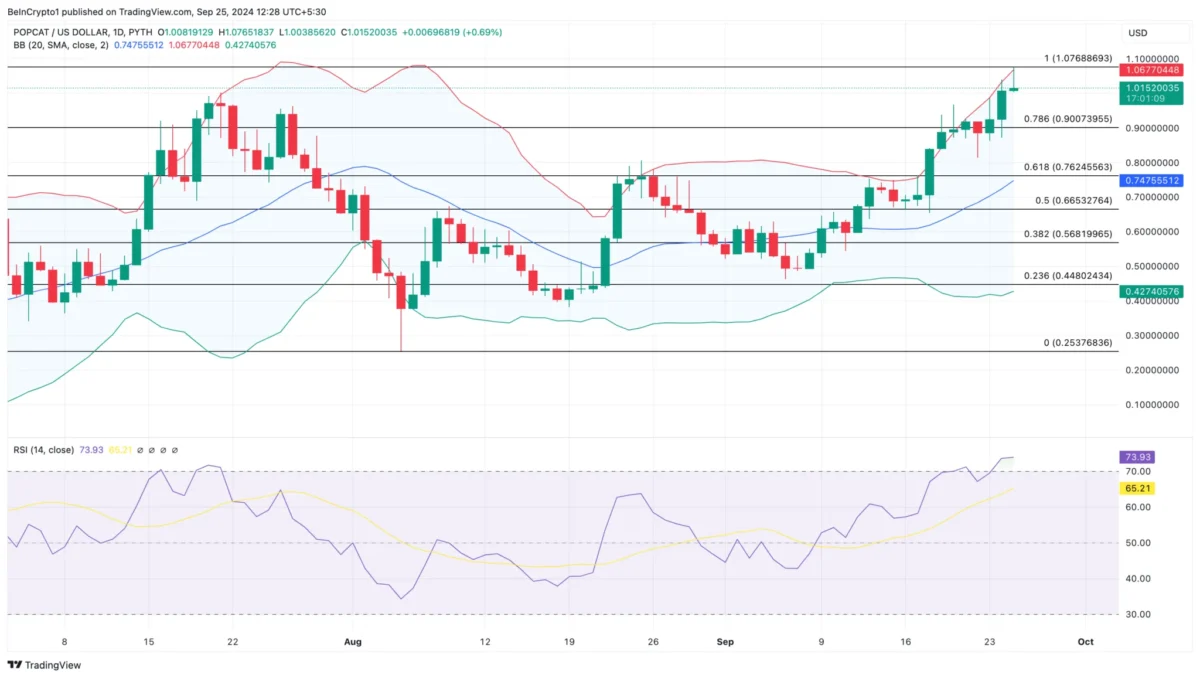 Meme coin fiyatı kısa süre önce üst banda 1,08 dolardan dokundu. Dolayısıyla, bu da tokenin aşırı satın alındığına işaret ediyor. Fiyat alt banda dokunmuş olsaydı, aşırı satım durumuna işaret ederdi. Bu arada, Göreceli Güç Endeksi (RSI) de şu anda 70’in üzerinde. Bu metrik de aşırı alım durumunu teyit ediyor. Bu da POPCAT’in fiyatında bir geri çekilme olasılığını daha da güçlendiriyor.
