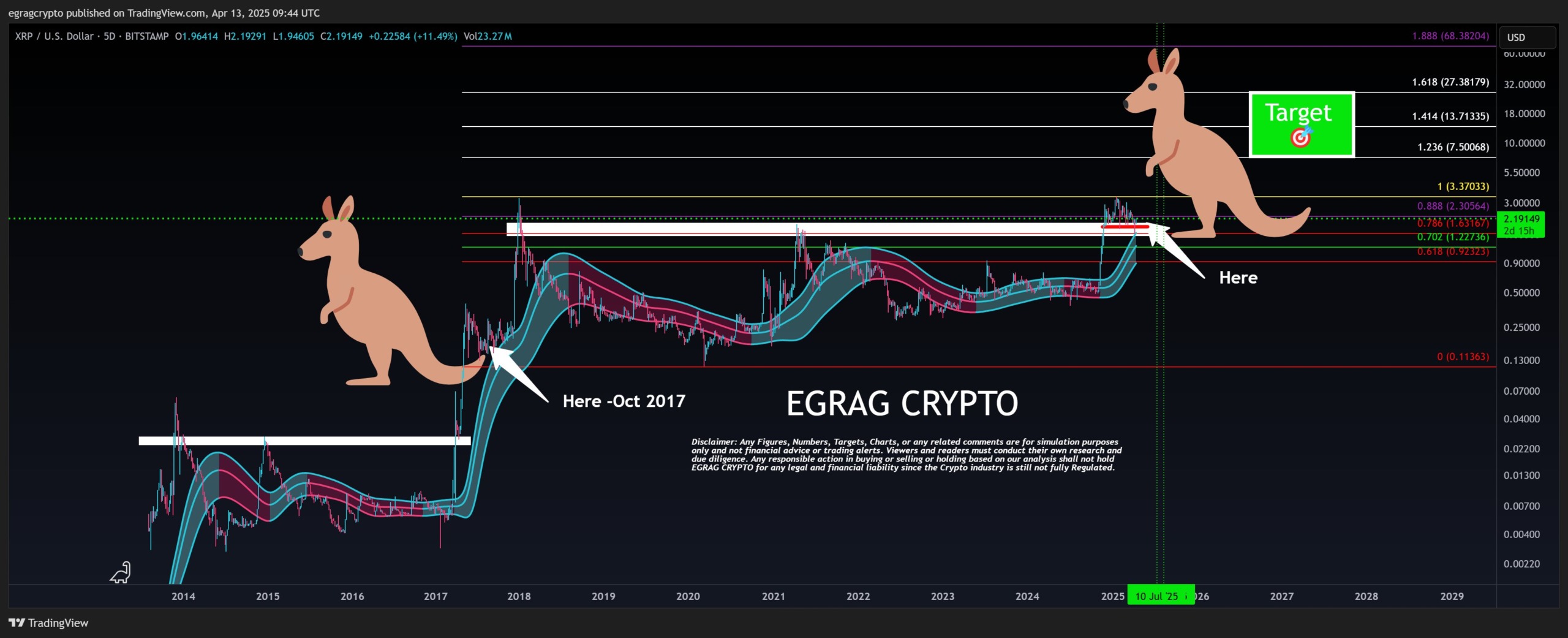 Popüler analist Egrag Crypto ise XRP için daha temkinli bir senaryo çiziyor. XRP’nin 5 günlük kapanışta 2,30 – 2,50 dolar bandının üzerine çıkamaması durumunda, fiyatın 1,85 dolara kadar gerileyebileceğini öne sürüyor. Ancak bu düşüş, Egrag’a göre uzun vadeli hedefleri engellemiyor. Analist, XRP’nin potansiyel olarak 7,50 – 13 – 27 dolar seviyelerine ulaşabileceğini savunuyor.