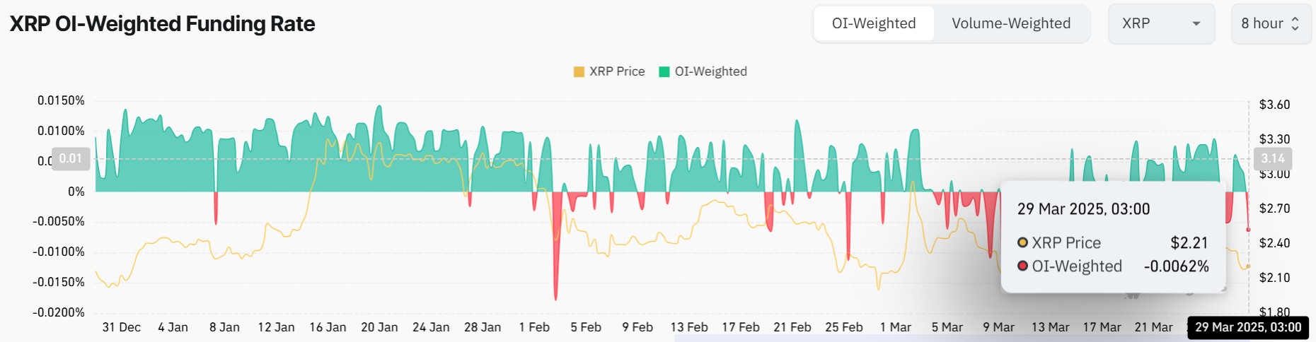 Analistler tarafından XRP için yapılan yükseliş tahminine rağmen, çeşitli faktörler fiyatın henüz bu yola girmediğini gösteriyor. Bu faktörlerden biri, türev piyasasındaki düşüş görünümü. Coinglass’tan alınan veriler, XRP fonlama oranlarının negatife döndüğünü gösteriyor. Bu da piyasaya daha fazla açığa satıcının girdiğinin bir göstergesi. Yani, düşmesini bekledikleri için XRP Coin fiyatına karşı pozisyon alan traderların sayısında artış var.