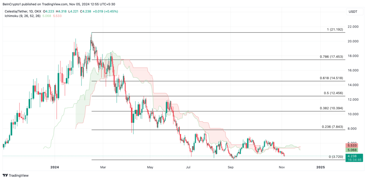 Celestia (TIA) fiyatı son yedi gündeki çift haneli düşüşün ardından Ichimoku Bulutunun altına indi. Bu gösterge bir varlığın piyasa eğilimlerini, momentumunu ve temel destek/direnç bölgelerini takip eder. Fiyat bulutun altına düştüğünde, aşağı yönlü ivmenin güçlendiğini gösteren düşüş aşamasına işaret eder. Bu durumda, Bulut bir direnç bölgesi olarak işlev görür. Ayrıca, önemli bir alım baskısı olmadan fiyatın tekrar yukarı çıkmasını zorlaştırır. Yazı sırasında altcoin, en son 6 Eylül’de ulaştığı yılın en düşük seviyesi olan 3,72 doların sadece %13 üzerinde, 4,23 dolardan işlem görüyordu. Artan satış baskısının TIA’yı bu destek seviyesine kadar geri itmesi mümkün.