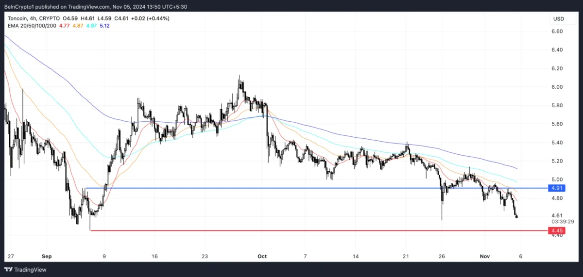 TON EMA çizgileri grafiği, fiyatının tüm EMA çizgilerinin altında işlem görmesi ve kısa vadeli çizgilerin uzun vadeli olanların altında konumlanmasıyla düşüş eğiliminde bir kurulum ortaya koyuyor. Ayrıca, sürekli bir düşüş trendine işaret ediyor. Bu hizalama, satıcıların şu anda kontrolde olduğunu ve düşüş trendinin devam edebileceğini gösteriyor. Bu formasyon devam ederse, altcoin fiyatı muhtemelen 4,45 dolar seviyesindeki desteği test edecek. Ayrıca, burada stabilizasyon arayışına girecek.