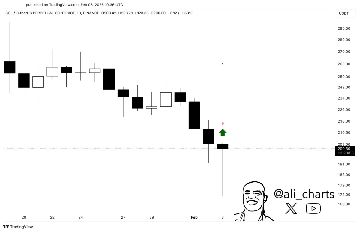 Hızlı işlem onaylarıyla tanınan Solana (SOL), geçtiğimiz yıl boyunca %100 oranında bir artış gösterdi. Ancak, son piyasa düzeltmesi nedeniyle fiyatı 200 dolar seviyesinin altına geriledi. Yazım sırasında SOL fiyatı, son 24 saatte %8’lik bir düşüşle 195 dolar seviyelerinden işlem görüyor. Bununla birlikte, analistler bu düşüşü bir alım fırsatı olarak değerlendiriyor. Kripto analisti Ali Martinez, SOL’un günlük grafiğinde TD Sequential göstergesinin potansiyel bir toparlanma sinyali verdiğini belirtiyor. Yatırımcılar, 2025’in Şubat ayında beklenen altcoin sezonu öncesinde SOL’un güçlü bir yükseliş yapmasını bekliyor.