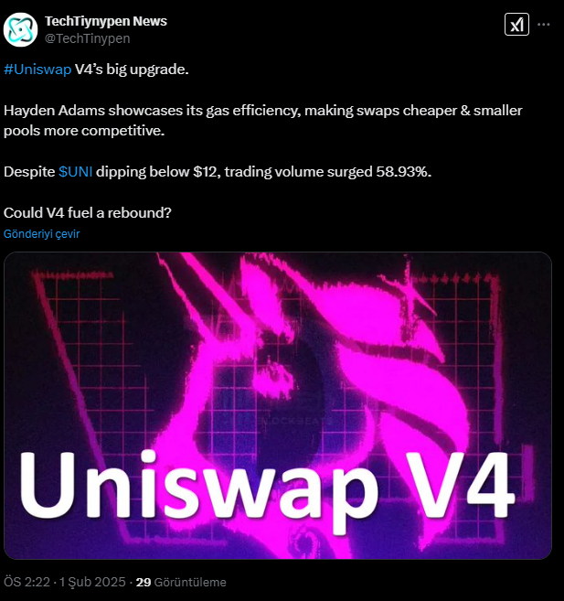 Uniswap (UNI), merkeziyetsiz ticaret protokollerinin önde gelen isimlerinden biri olarak, geniş bir işlem hacmine sahipti. Ancak, piyasa düzeltmesi nedeniyle fiyatı 9 dolar seviyelerine düştü. Bu düşüş, Uniswap V4’ün tanıtımının ardından gerçekleşti. Bu yeni versiyon, işlem verimliliği ve likiditeyi artırmayı hedefliyor. Yatırımcılar, 2025 yılında beklenen altcoin sezonu öncesi, Uniswap’ı potansiyel kazanç elde etmek için fırsat olarak değerlendiriyor. Yazıyı sonlandırmadan önce, bunların yalnızca analist görüşü olduğunu ve her yatırımcının kendi araştırmaları doğrultusunda yatırım yapması gerektiğini belirtmekte fayda var.
