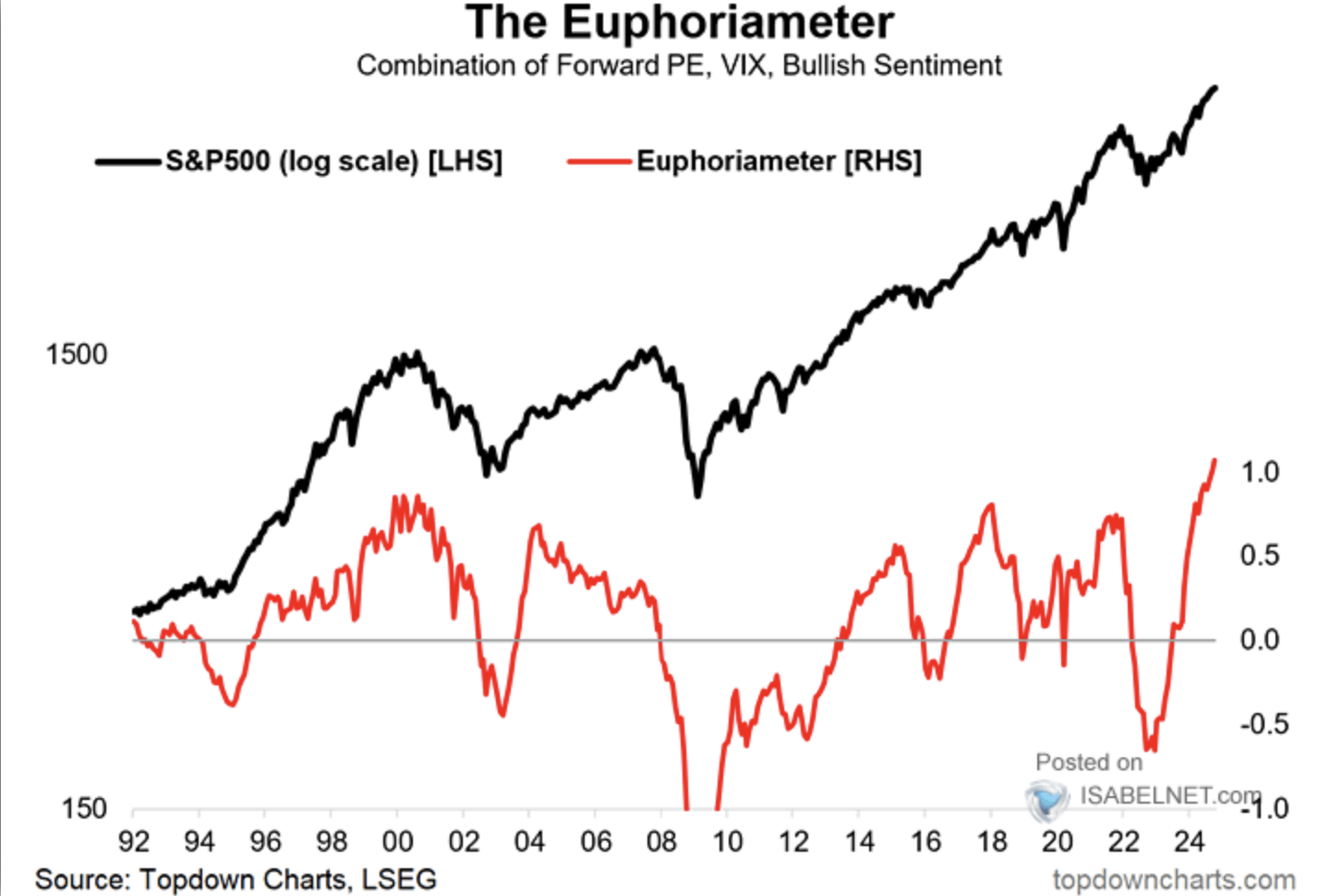 Grafik, 1992 yılından 2024 yılına kadar olan dönemi kapsıyor ve iki önemli veriyi karşılaştırıyor: S&P 500 endeksi (siyah çizgi, logaritmik ölçek) ve Euphoriameter (kırmızı çizgi).