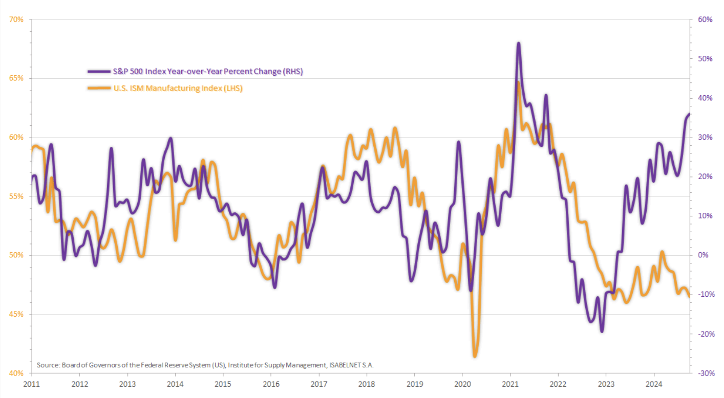 Bu grafikte de S&P 500 endeksinin yıllık yüzde değişimi (mor çizgi, sağ eksen) ile ABD ISM İmalat Endeksi (turuncu çizgi, sol eksen) arasındaki ilişki inceleniyor. Veriler 2011’den 2024’e kadar olan dönemi kapsıyor ve ekonomideki genel eğilimler ile hisse senedi piyasası arasındaki bağlantıyı ortaya koyuyor.