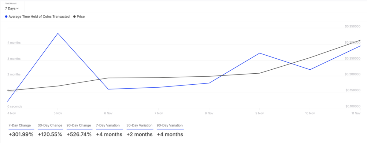 DOGE’un performansına yönelik on-chain analizler, geçtiğimiz hafta işlem gören coinlerin elinde tutulma sürelerinin önemli bir artış kaydettiğini ortaya koyuyor. IntoTheBlock verilerine göre, bu süre %302 oranında arttı.
